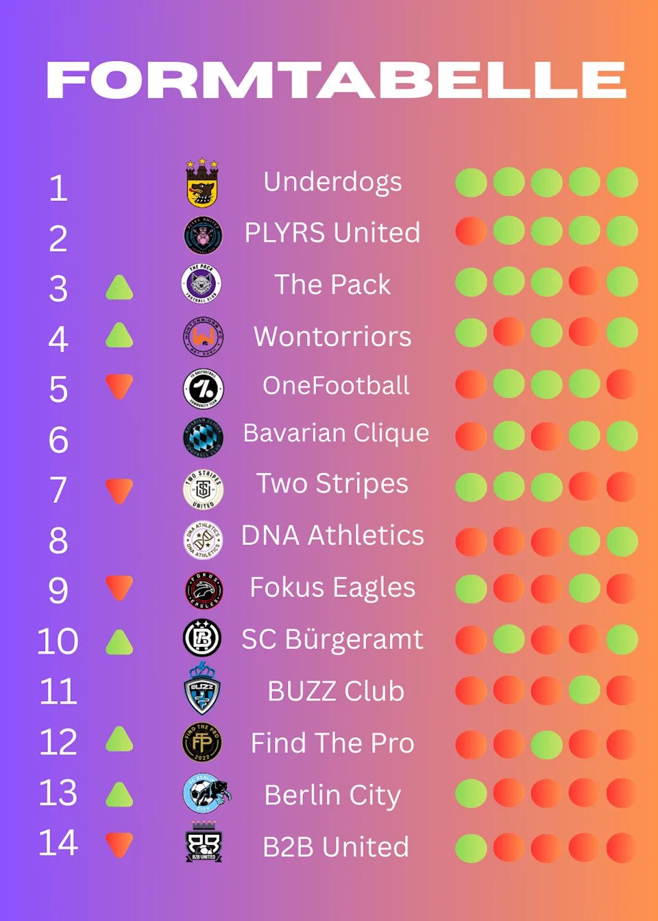 The Berlin Underdogs can no longer be pushed out of the top four and are thus safely qualified for the finals in Vienna. Only Two Stripes United could still push them from first place. The team of Felix Kroos and Robert Andrich has secured participation in the play-ins.