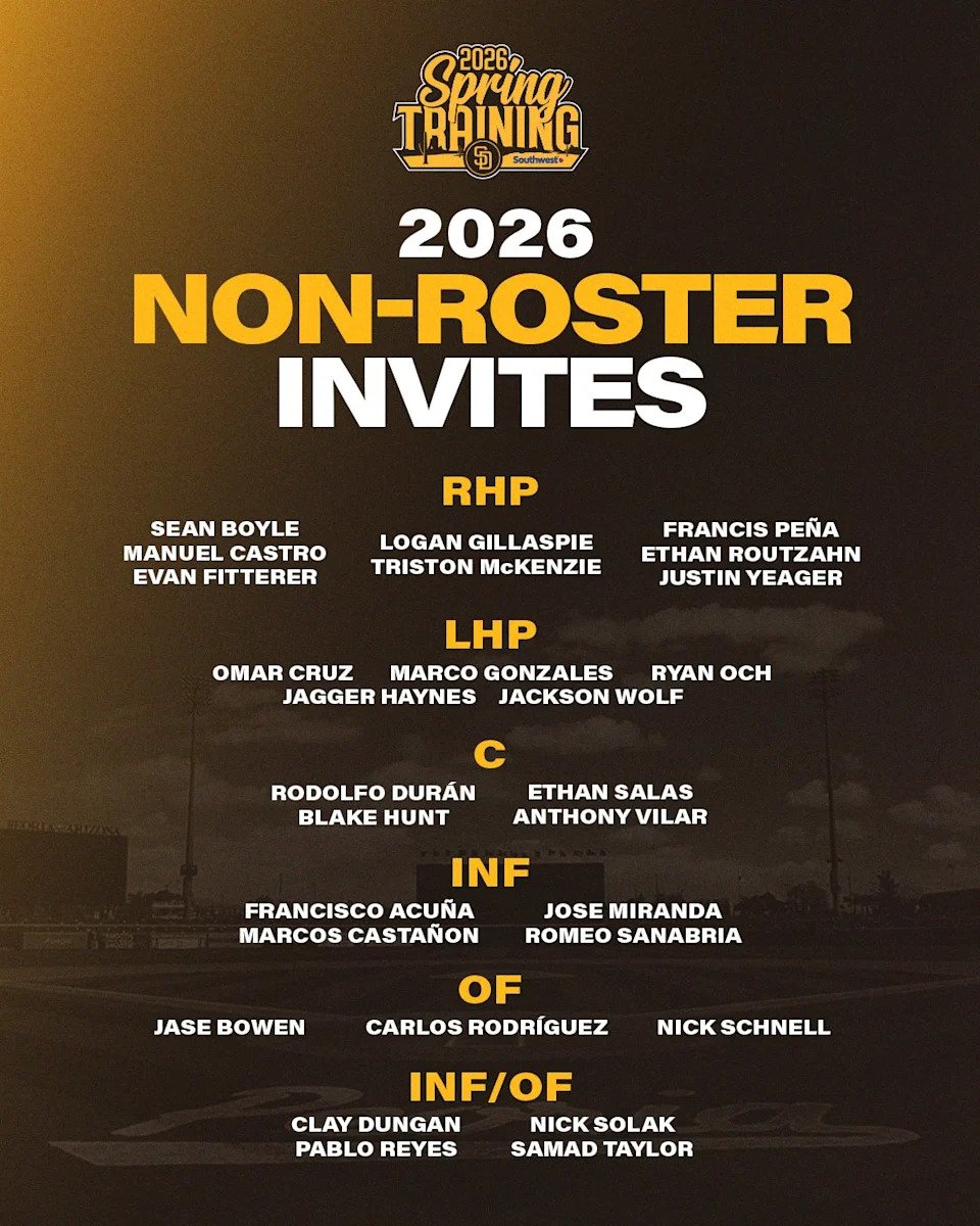 The organization recently announced 28 players invited to Spring Training who are not on the roster. Those players (NRI’s) include 13 players who were recently added to the organization. There are 13 pitchers, four catchers, seven infielders and four outfielders in the group. It includes the Padres No. 1 prospect Ethan Salas who missed most of the 2025 season due to a stress fracture in his lower back. Following is the full list of NRI: