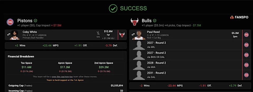 What can the Bulls get for Coby White on the brink of free agency? The Minnesota Timberwolves are reportedly interested, but I’m skeptical Minnesota would accept on a deal that sends Joan Beringer and Rob Dillingham to Chicago for White. Chicago should prefer that Minnesota deal over this Pistons offer if it has it on the table, but if not, I still think this package from Detroit is acceptable. The Pistons need another ball handler and shooter next to Cade Cunningham, and White can be instant offense when he’s at his best. This trade returns Paul Reed to Chicago, a DePaul alum, who is on a cheap $5.5 million deal next year and can provide big man depth. It also gives the Bulls four second-round picks that have a chance to be in the top half of that round. If the Bulls aren’t going to sign White in free agency, getting a haul for him now makes sense even if they can’t land a first-rounder.