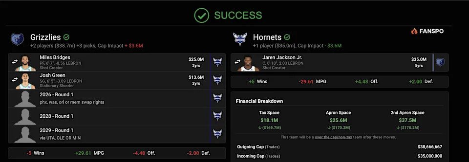 The Charlotte Hornets were by far the best team in the NBA during January. This team has an extremely bright future if LaMelo Ball can stay healthy next to Brandon Miller and Kon Knueppel, but they still need a big man who can block shots and stretch the floor as a shooter. Those players are extremely hard to come by, but Jaren Jackson Jr. fits the bill. I debated whether there should be two or three future first-round picks going back to Memphis in this deal, but it makes sense for both sides either way. The Hornets really could be poised to contend in the East next year, especially if they land a player like JJJ. Memphis would be leaning fully into a rebuild.