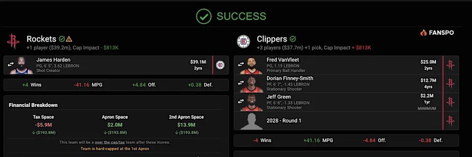James Harden wants out from the Clippers, and his former team the Houston Rockets make a lot of sense. The Rockets and Clippers can haggle over the protections on this 2028 first-round pick, but deal essentially sends three of Houston’s non-contributors this season to Los Angeles for a near All-Star level point guard. Harden is still pretty damn good at age-36, and he could give the Rockets the shooting and playmaking juice they need for a playoff run.
