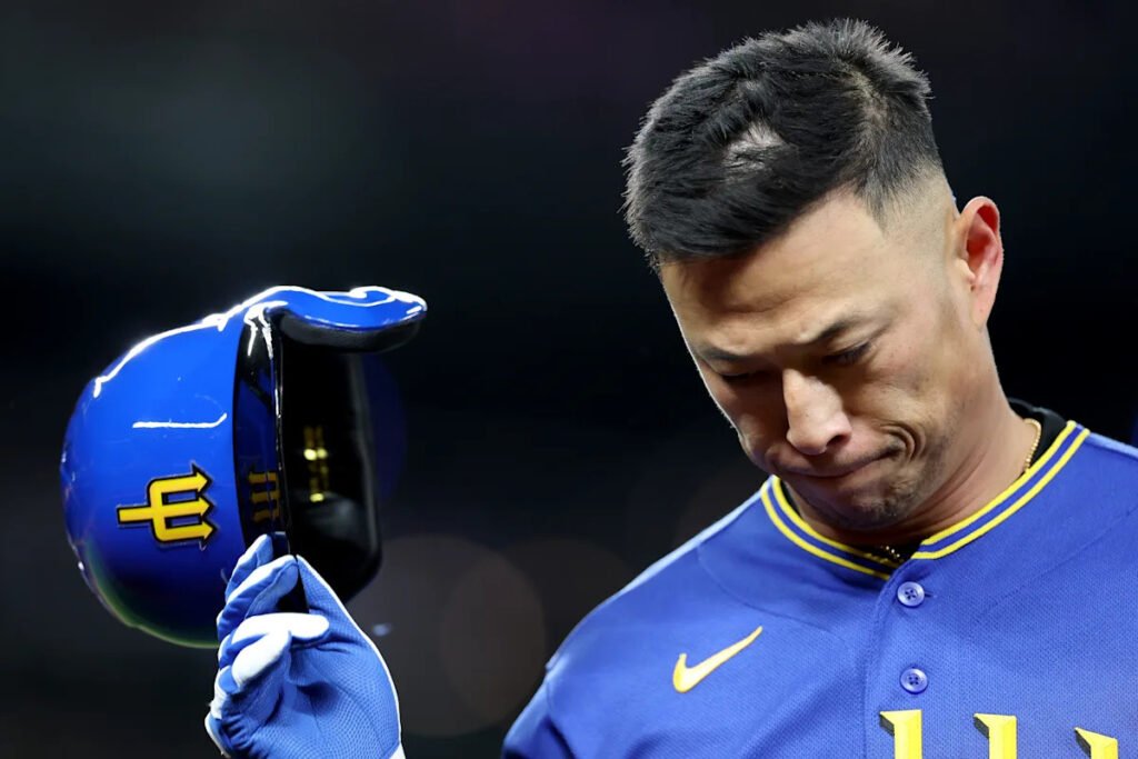 SEATTLE, WASHINGTON – APRIL 17: Rob Refsnyder #90 of the Seattle Mariners reacts after lining out during the eighth inning against the Texas Rangers at T-Mobile Park on April 17, 2026 in Seattle, Washington. (Photo by Steph Chambers/Getty Images) | Getty Images