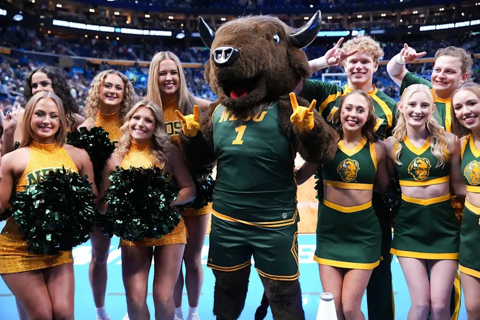 The North Dakota State Bison mascot and cheerleaders pose for a photo before the game against the Michigan State Spartans during a first round game of the men’s 2026 NCAA Tournament at Keybank Center on March 19, 2026 in Buffalo, NY