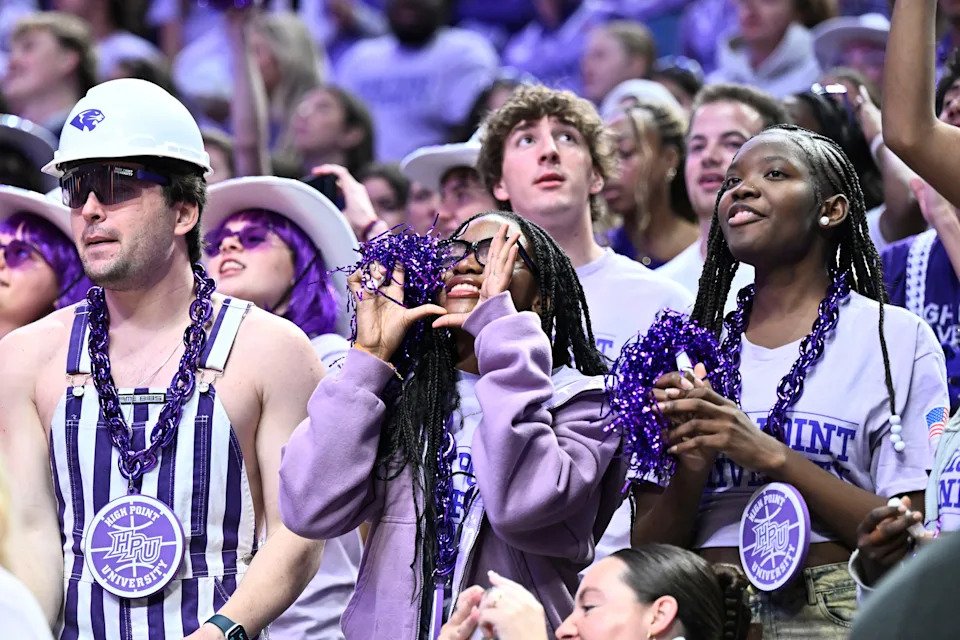High Point Panthers fans cheer prior to a first round game of the men’s 2026 NCAA Tournament against the Wisconsin Badgers at Moda Center on March 19, 2026 in Portland, Or.
