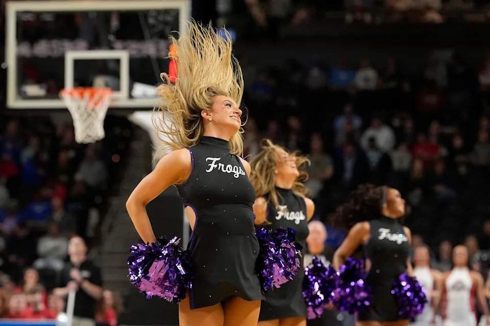 The Texas Christian University Horned Frogs cheerleaders perform in the first half during a first round game of the men’s 2026 NCAA Tournament at Bon Secours Wellness Arena on March 19, 2026 in Greenville, SC.