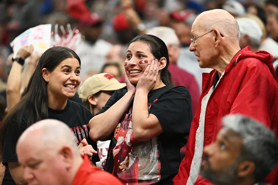 Nebraska Cornhuskers fans cheer after defeating the Troy Trojans during a first round game of the men’s 2026 NCAA Tournament at Paycom Center on March 19, 2026 in Oklahoma City.