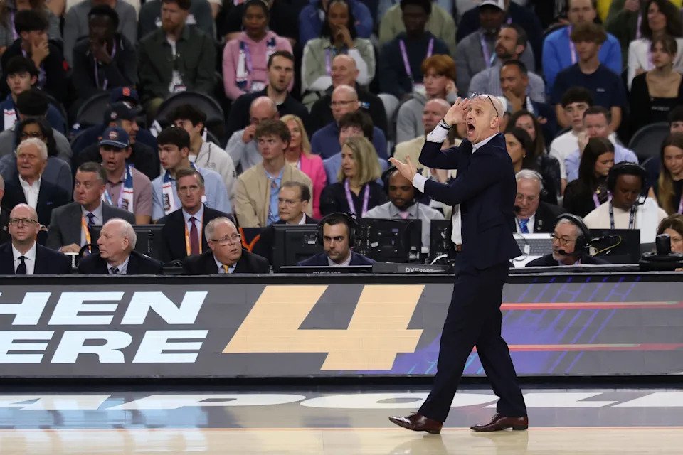 UConn Huskies head coach Dan Hurley gets after his team Saturday, April 4, 2026, during a Final Four game against the Illinois Fighting Illini at Lucas Oil Stadium in Indianapolis.
