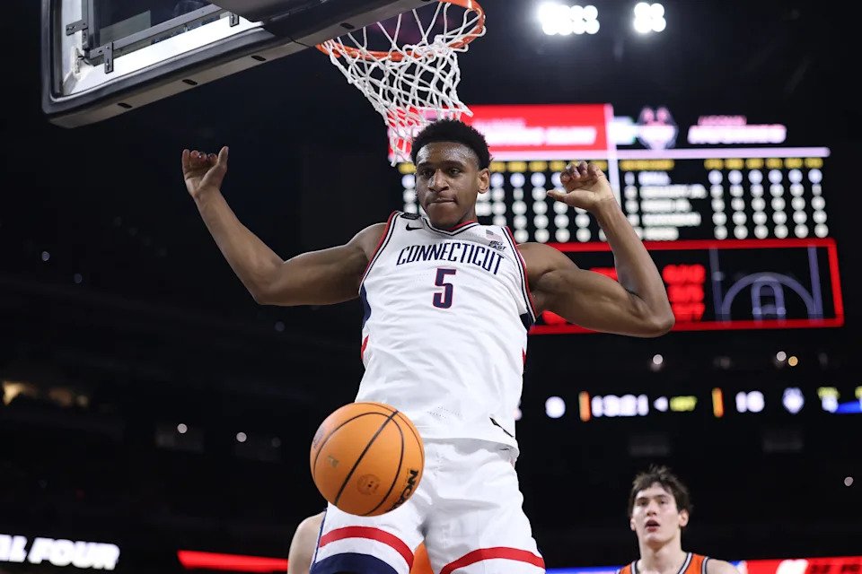 Tarris Reed Jr. #5 of the UConn Huskies dunks the ball against the Illinois Fighting Illini in the first half of the Final Four of the 2026 NCAA Men’s Basketball Tournament at Lucas Oil Stadium on April 04, 2026 in Indianapolis, Indiana.