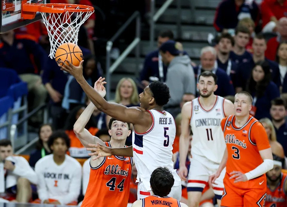 Tarris Reed Jr. #5 of the UConn Huskies shoots a layup against Zvonimir Ivisic #44 of the Illinois Fighting Illini in the first half of the Final Four of the 2026 NCAA Men’s Basketball Tournament at Lucas Oil Stadium on April 04, 2026 in Indianapolis, Indiana.