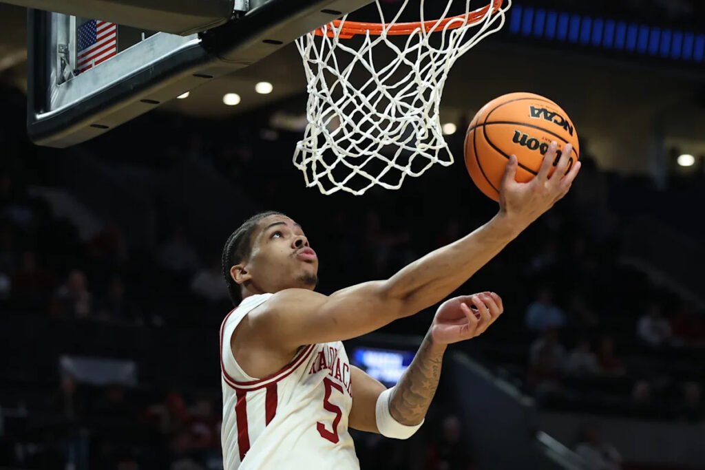 Arkansas (27-8) moves on to face No. 12 High Point in the second round of the West Region. The Panthers knocked off No. 5 Wisconsin 83-82 in the first game in Portland.