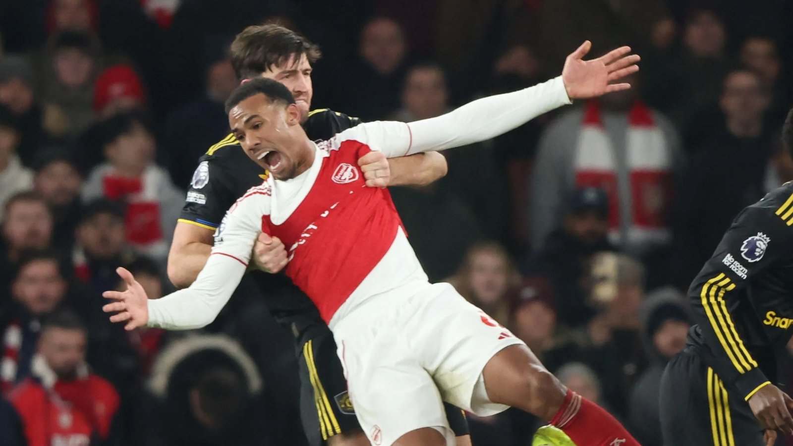 Harry Maguire and Gabriel battle off the ball deep into added time at the EmiratesCredit: Shutterstock Editorial