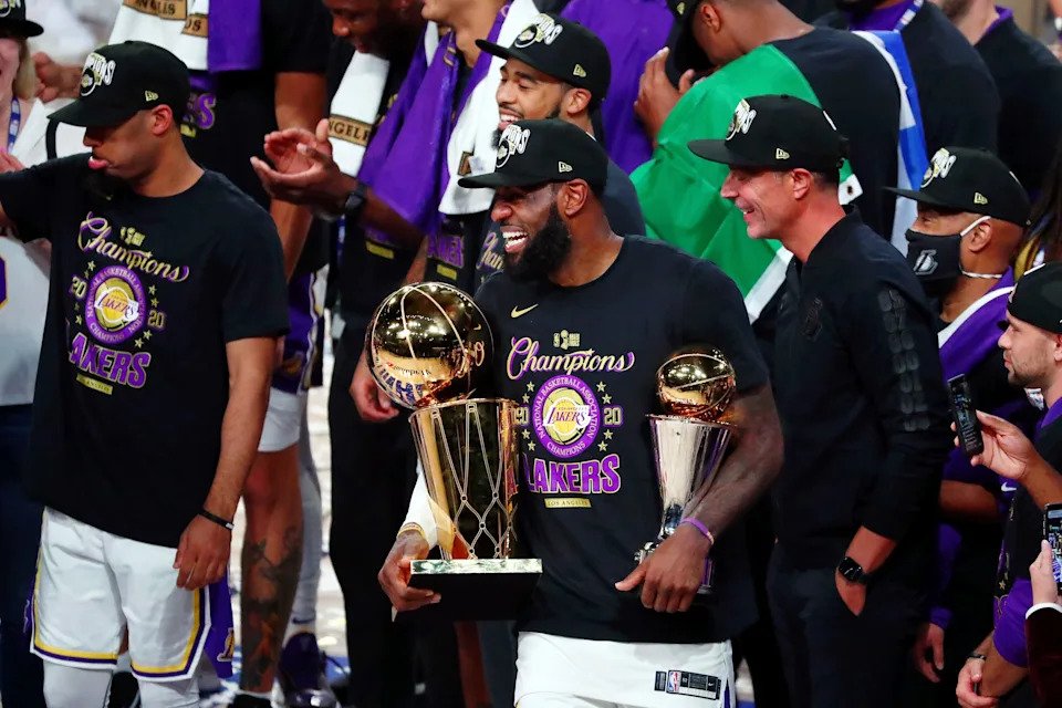 Oct. 11, 2020: LeBron James smiles while holding the NBA Finals and MVP trophies after Game 6 of the 2020 NBA Finals at AdventHealth Arena. The Los Angeles Lakers won 106-93 to win the series against the Miami Heat.