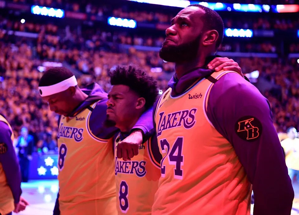 Jan. 31, 2020: LeBron James reacts during the national anthem after a pregame tribute to Kobe Bryant before playing the Portland Trail Blazers at Staples Center.