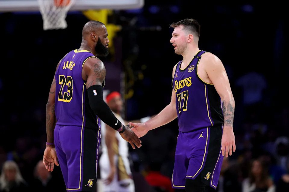 April 4, 2025: LeBron James #23 and Luka Doncic #77 of the Los Angeles Lakers shake hands against the New Orleans Pelicans during the second quarter at Crypto.com Arena in Los Angeles.