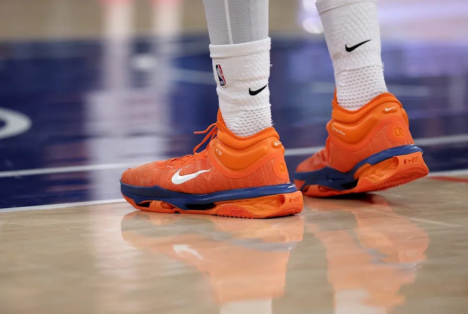 NEW YORK, NEW YORK – APRIL 18: The shoes of Karl-Anthony Towns #32 of the New York Knicks are seen during the first half of Game One of the Eastern Conference First Round NBA Playoffs against the Atlanta Hawks at Madison Square Garden on April 18, 2026 in New York City. NOTE TO USER: User expressly acknowledges and agrees that, by downloading and or using this photograph, User is consenting to the terms and conditions of the Getty Images License Agreement. (Photo by Elsa/Getty Images)