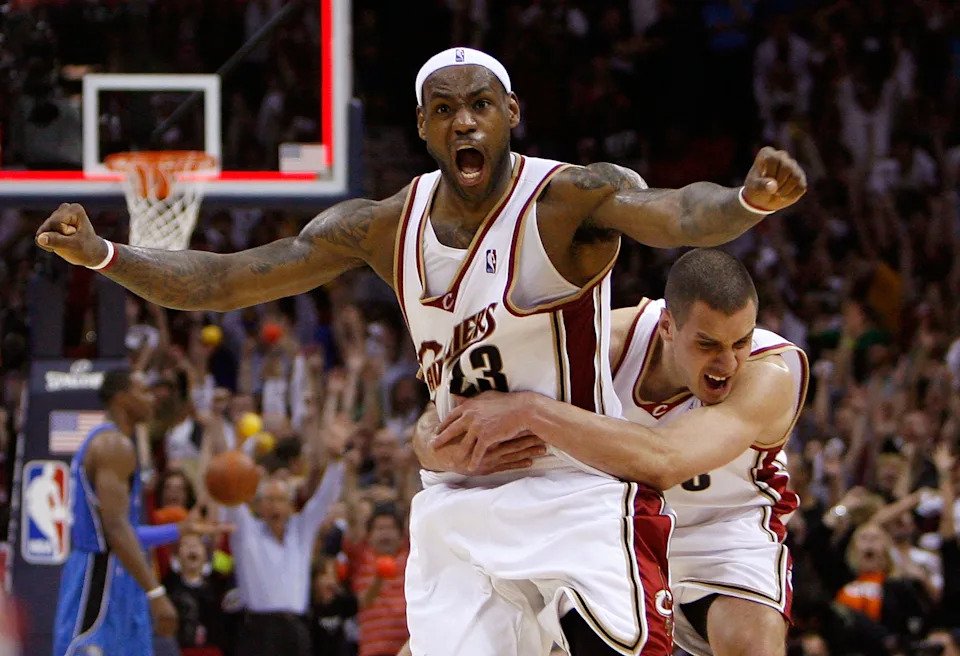 LeBron James #23 and Sasha Pavlovic #3 of the Cleveland Cavaliers celebrate after James made the game winning three pointer against the Orlando Magic in Game Two of the Eastern Conference Finals.