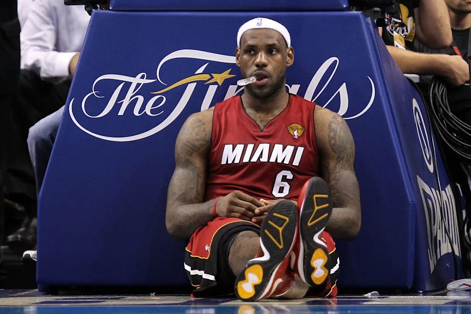 LeBron James #6 of the Miami Heat sits on the court as court attendants mop up liquid agaisnt the Dallas Mavericks in the second half of Game Three of the 2011 NBA Finals at American Airlines Center on June 5, 2011.
