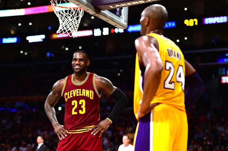March 10, 2016: LeBron James of the Cleveland Cavaliers jokes with Kobe Bryant of the Los Angeles Lakers during a 120-108 Cavaliers win at Staples Center.