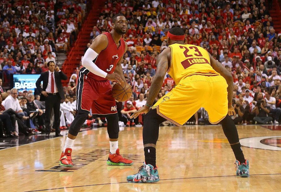 Dec. 25, 2014: Dwyane Wade sizes up LeBron James during a game at American Airlines Arena.