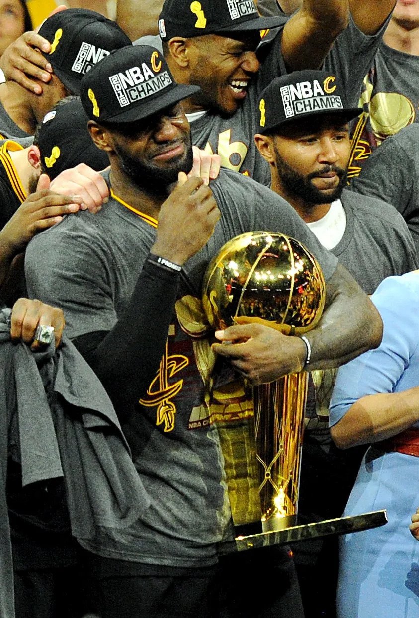June 19, 2016: LeBron James and Kevin Love celebrate after defeating Golden State in Game 7 of the NBA Finals for the first championship in Cavaliers history.