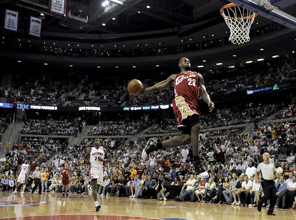 LeBron James #23 of the Cleveland Cavaliers gets in for a first quarter break away dunk in front of Antonio McDyess #24 of the Detroit Pistons in Game Four of the Eastern Conference Quarterfinals during the 2009 NBA Playoffs at the Palace of Auburn Hills on April 26, 2009.
