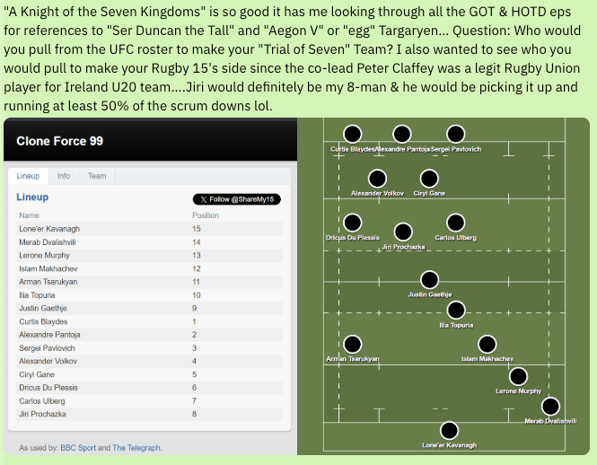 “A Knight of the Seven Kingdoms” is so good it has me looking through all the GOT & HOTD eps for references to “Ser Duncan the Tall” and “Aegon V” or “egg” Targaryen… Question: Who would you pull from the UFC roster to make your “Trial of Seven” Team? I also wanted to see who you would pull to make your Rugby 15’s side since the co-lead Peter Claffey was a legit Rugby Union player for Ireland U20 team….Jiri would definitely be my 8-man & he would be picking it up and running at least 50% of the scrum downs lol.