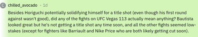 Besides Horiguchi potentially solidifying himself for a title shot (even though his first round against wasn’t good), did any of the fights on UFC Vegas 113 actually mean anything? Mario Bautista looked great but he’s not getting a title shot any time soon, and all the other fights seemed low-stakes (except for fighters like Barriault and Niko Price who are both likely getting cut soon).