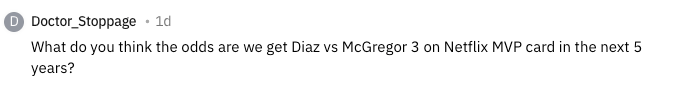What do you think the odds are we get Diaz vs McGregor 3 on Netflix MVP card in the next 5 years?