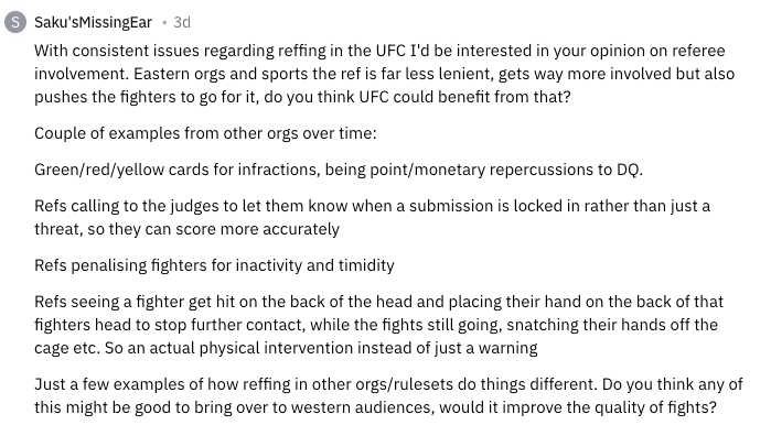 With consistent issues regarding reffing in the UFC I’d be interested in your opinion on referee involvement. Eastern orgs and sports the ref is far less lenient, gets way more involved but also pushes the fighters to go for it, do you think UFC could benefit from that?