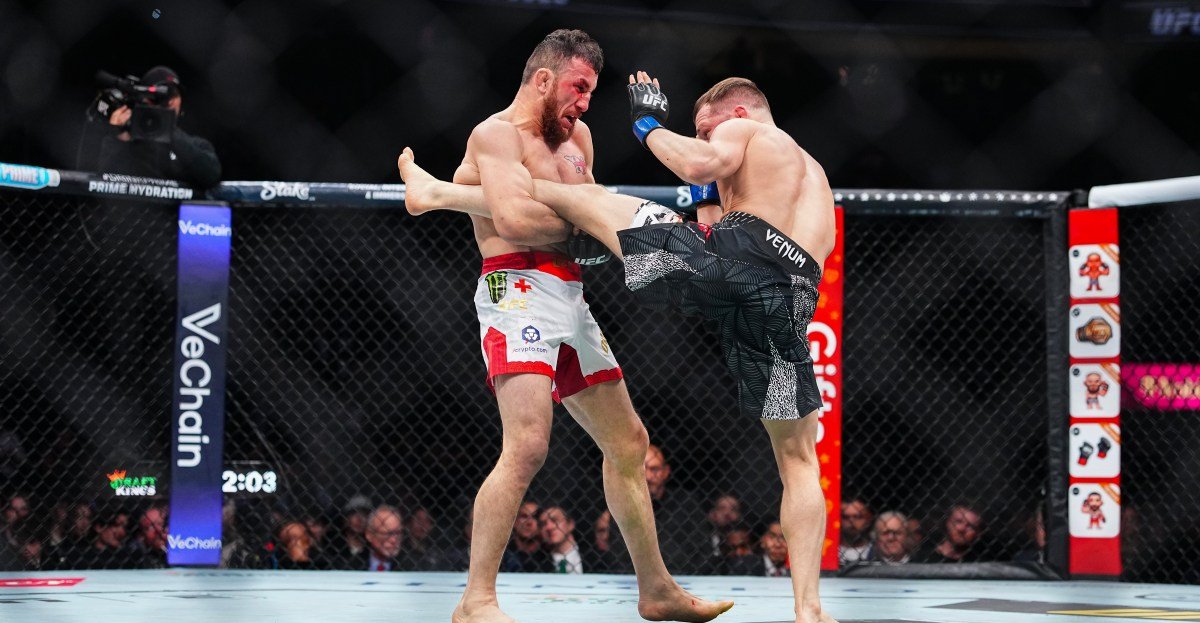 Hard left to Dvalishvili’s chin, he just eats it. Dvalishvili deep on a takedown and he just picks Yan up over his shoulder and plays to the crowd. Big slam, but Yan right back up. Dvalishvili not able to control him, but the pressure is somehow only increasing. How the hell does he do this?