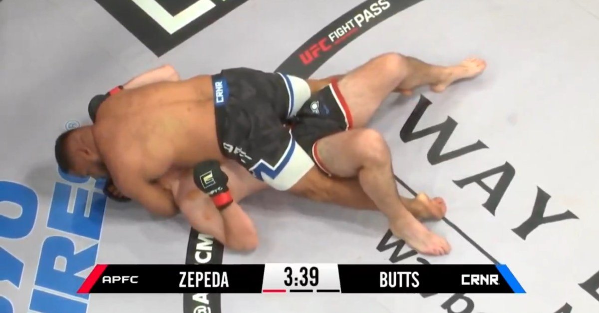 That all changed when Butts faced the debuting Antonio Zepeda. After landing a sweet slam, Butts quickly advanced to full mount and broke Zepeda down with heavy elbows. Then, he sent the crowd into a frenzy with a picturesque (?) smother choke that forced Zepeda to tap less than 90 seconds into Round 1.