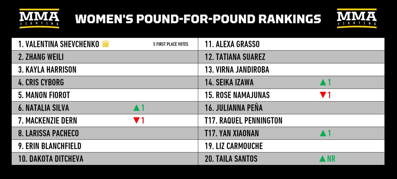 Recent results for ranked fighters (previous ranking shown): No. 4 Cris Cyborg def. Sara Collins, No. 7 Natalia Silva def. No. 14 Rose Namajunas, No. 9 Erin Blanchfield def. Tracy Cortez, No. 15 Seika Izawa def. Rena Kubota