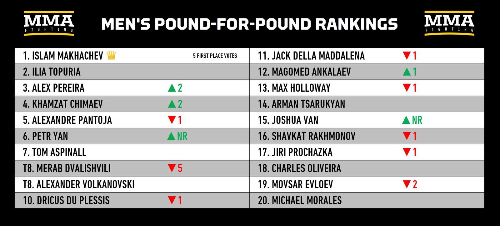 Entering Saturday’s event, Dvalishvili (3) and Pantoja (4) were entrenched in our top 5 and while Yan’s incredible performance was guaranteed to bump Dvalishvili down a few spots, the abrupt end to Pantoja’s championship reign left our panel divided on what to make of his loss and how much Van should gain from the win.
