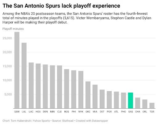 There is a notion that teams have to have a playoff run under their belt before they can be taken seriously. Last year’s Thunder seem to be classic examples of this “you have to walk before you can run” concept, having been ousted in the Western Conference semifinals by the Dallas Mavericks in 2024 before going all the way last year. While that’s true, the Wemby Spurs actually have more playoff minutes under their belt than last year’s OKC team, which ranked second-fewest in the playoff field.
