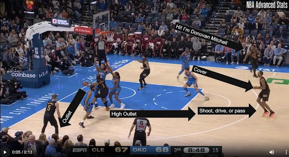 Boy howdy! That’s a lot of resources to commit above the three-point line. Three players and both bigs! Is space tight? Does the best defense in basketball (by my eyes) have the Cavs in jail? No. Chet Holmgren (Mobley’s defender) is waiting at the arc but won’t go further. Allen’s defender is right behind him, effectively double-covering meaningless space. Mitchell’s defender is glued to him in the corner. And where is Sam Merrill? Where is his defender? They are so deep in the opposite corner that they aren’t even in the picture.