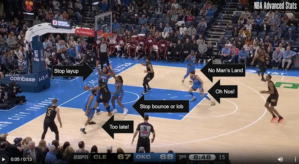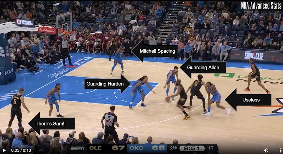 The action continues. Harden has the corner. His defender no longer matters. Allen reads it and slips the screen, making minimal contact. OKC switches assignments because they are great at basketball. Mitchell and Merrill’s defenders stay home because OKC is good. Mobley is effectively unguarded.