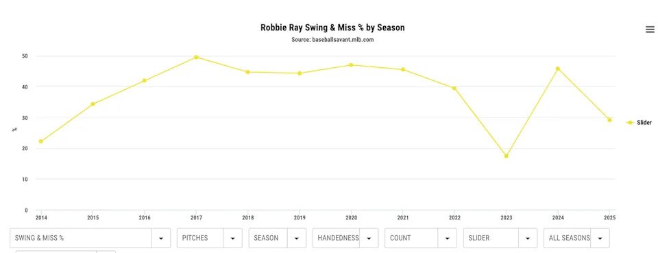 As you can see, in 2025, the slider’s whiff-% came in at 29% — Ray’s lowest mark ever in a full season of work.