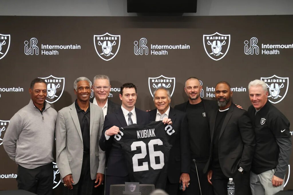 Three took seats to the left and the other three to the right before new Las Vegas coach Klint Kubiak was formally introduced Tuesday and sat with general manager John Spytek in the middle with the club’s three Lombardi Trophies in front of them.