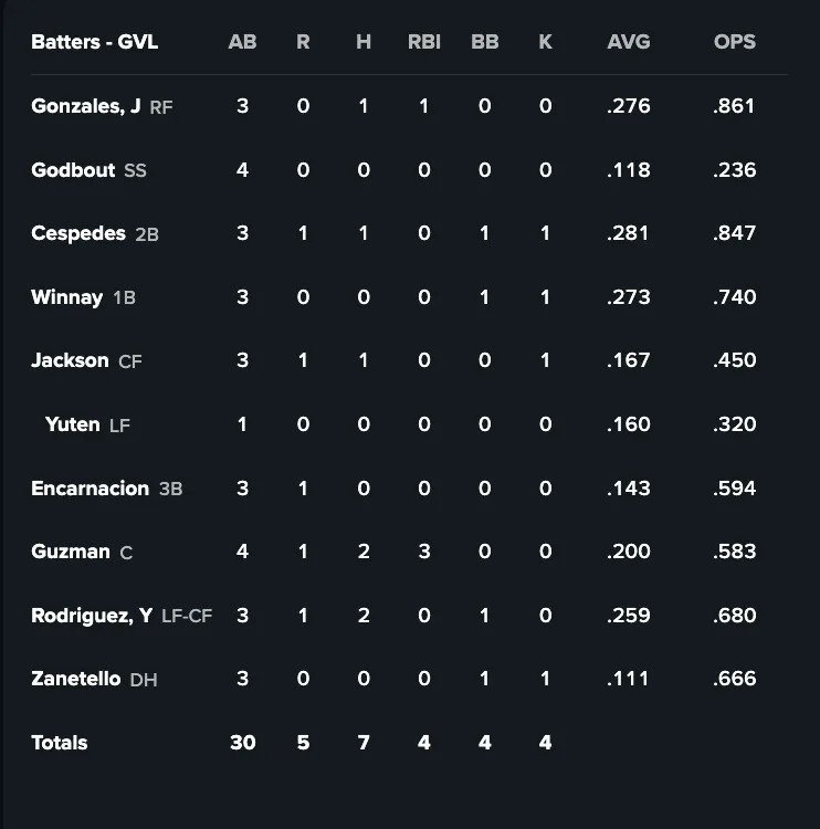 Greenville’s top six batters combined for two hits in the finale in “Hub City”, aka Spartanburg (Rangers High-A) and Henry Godbout’s glove (and arm) was a liability as he committed three errors on the evening. This game was actually Greenville’s to lose heading into the bottom of the sixth despite the defensive difficulties as well as last year’s compensatory pick Marcus Phillips only lasting three innings, but the Drive bullpen couldn’t hold the middle-inning lead for even a half inning and there was no late action to speak of offensively.