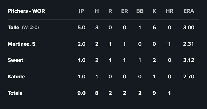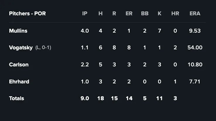 Hayden Mullins still hasn’t quite found it this seson – it being longevity or the ability to keep runners off the basepaths – but it is certainly promising to see him strike out seven Fisher Cats (Blue Jays AA) in his four innings. Portland’s offense was abundant and four stolen bases helped put runs on the board. But it was no match for Joe Vogatsky, Max Carlson and noted position player Drew Ehrhard all getting knocked around on the mound. Luckily, the latter hit a home run later in the inning but the deficit was still far too much.