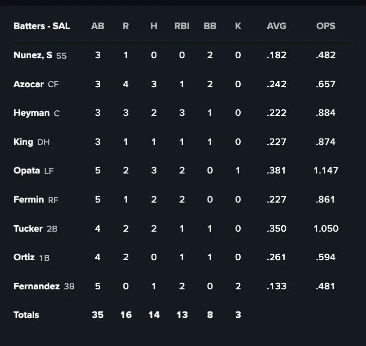 If “early and often” had a picture, it’d be the rolling RidgeYak’s game against Wilson (Brewers A) scoring multiple runs in innings two through seven and improving to 7-2 on the young season. Blake Futrell helped matters with a hitless five innings; Salem actually took a no-hitter into the seventh but by that point the team was up 12-0 anyway, and also to that point, they hadn’t hit one over the fence. The game’s first home run was actually Salem’s last of sixteen runs, when Luke Heyman scores Enddy Azocar, who was on with his third hit. All told, Salem had fourteen hits and eight walks and this game was never in doubt.