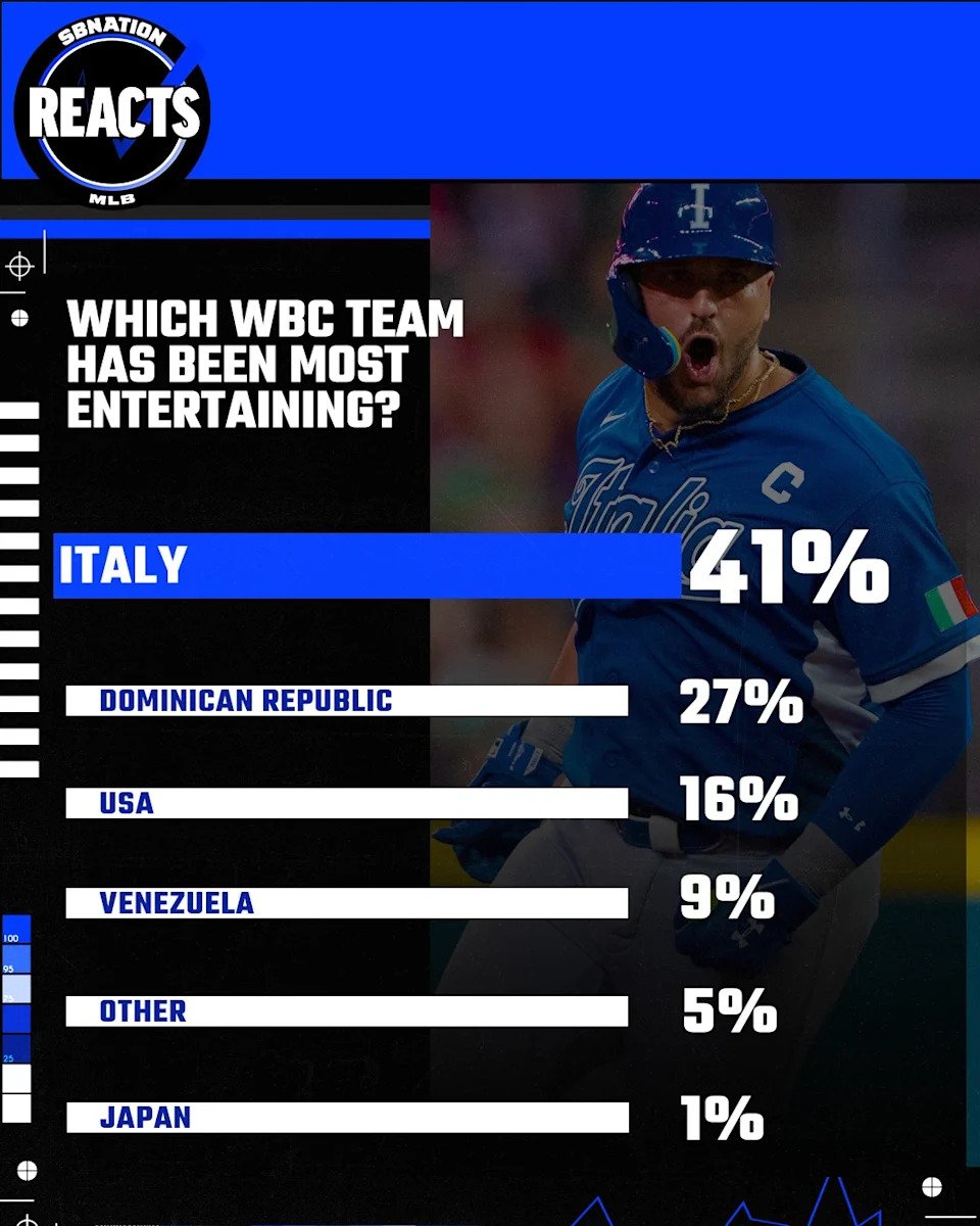 All of the first three answers were good things about the WBC. Certainly, high-intensity baseball, the choice of the plurality, was a good thing. But I liked the player energy and celebrations and that was my choice. That’s the sort of thing we don’t often see in MLB, and I really liked seeing players from countries like Venezuela, the Dominican Republic and others really seem to be having fun. Even the Italian-Americans representing Italy made the WBC a happy place with their espresso machine celebration. Speaking of which…