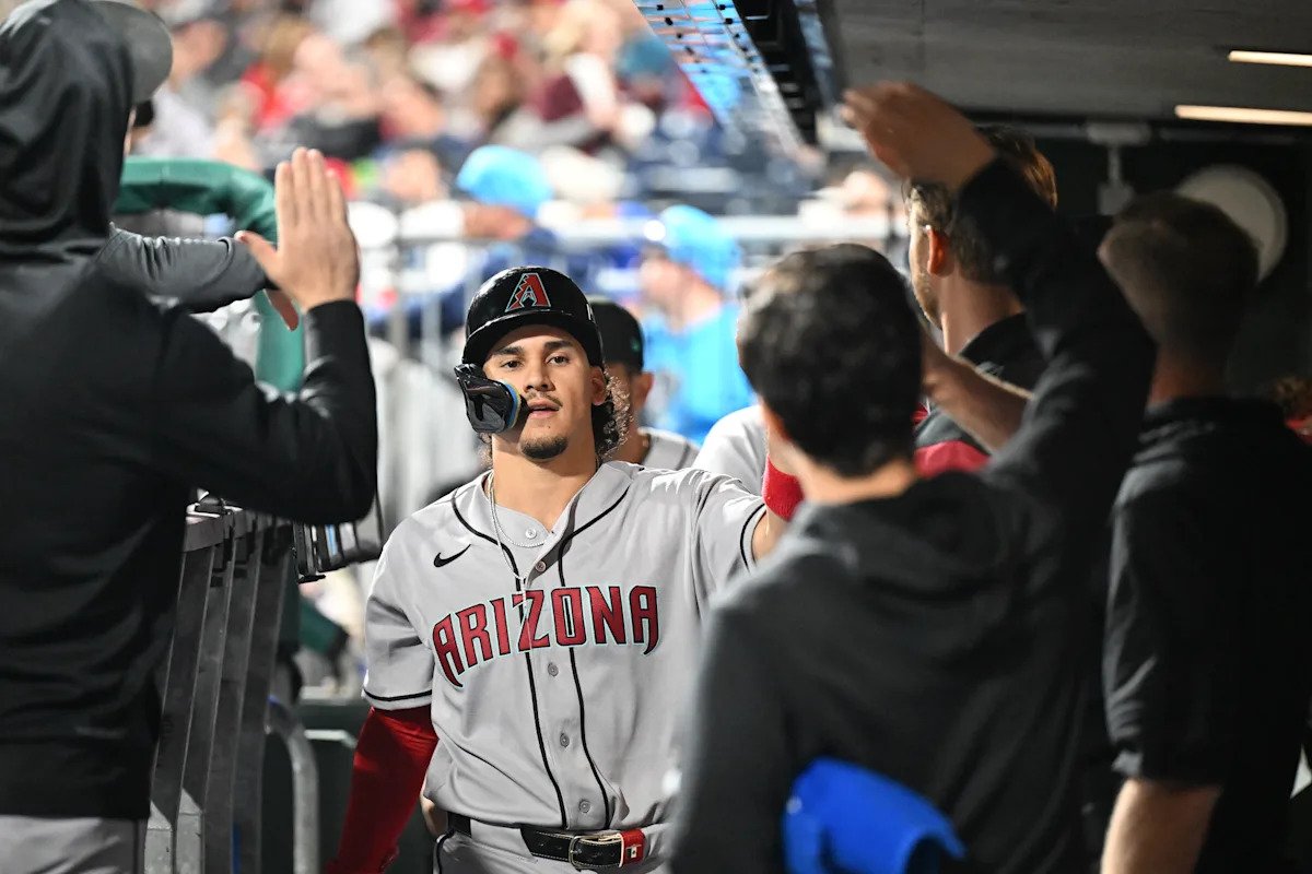 PHILADELPHIA, PA – APRIL 10: Arizona Diamondbacks center fielder Alek Thomas #5 celebrates in the dugout during the game between the Philadelphia Phillies and the Arizona Diamondbacks on April 10th, 2026 at Citizens Bank Park in Philadelphia, PA. (Photo by Terence Lewis/Icon Sportswire via Getty Images) | Icon Sportswire via Getty Images