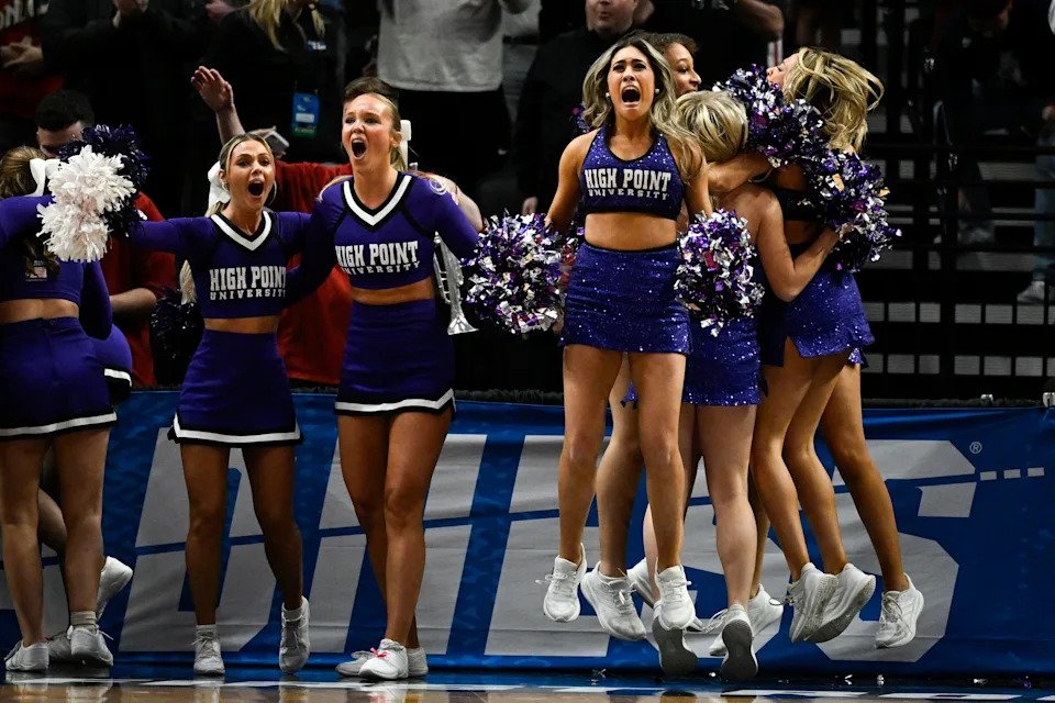 The High Point Panthers cheerleaders react during the second half of a first round game of the men’s 2026 NCAA Tournament against the Wisconsin Badgers at Moda Center on March 19, 2026 in Portland, Or.