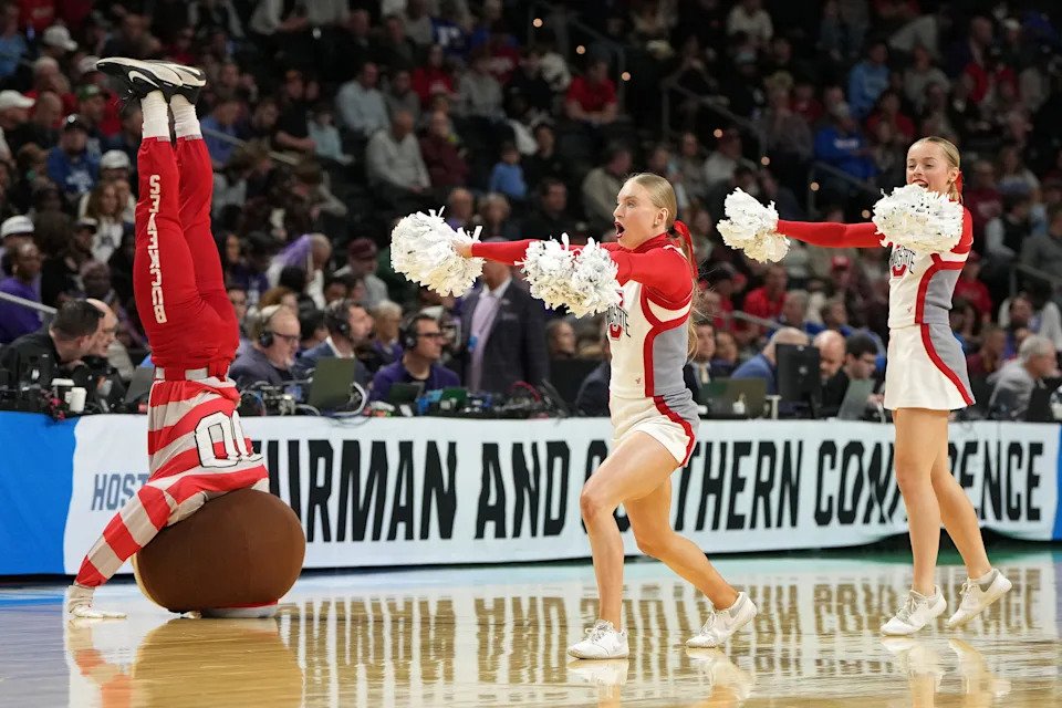 The Ohio State Buckeyes cheerleaders perform in the second half during a first round game of the men’s 2026 NCAA Tournament at Bon Secours Wellness Arena on March 19, 2026 in Greenville, SC.