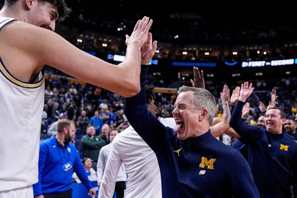 Michigan head coach Dusty May high-fives players after 95-72 win over Saint Louis at the NCAA Tournament Second Round at KeyBank Center in Buffalo on Saturday, March 21, 2026.