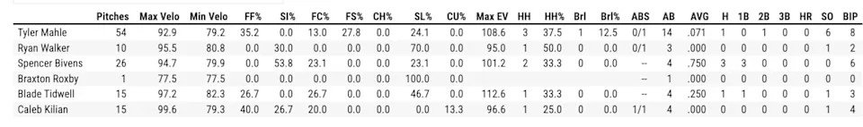 While the typical 1-2 punch of his four-seam and splitter were present today (accounting for 4 of his 6 strikeouts), Mahle evened out his mix on the day to focus on his slider.