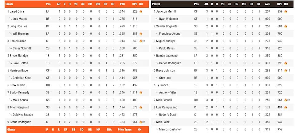 In their 3-1 loss against the San Diego Padres, San Francisco bats went hitless in a baker’s dozen worth of at-bats, including three duds in the 9th inning after Osleivis Basabe’s lead-off triple. Tyler Fitzgerald’s sacrifice fly in the 7th accounted for the Giants’ solitary run, so “perfectly inept” isn’t exactly right — just near-perfect once again.