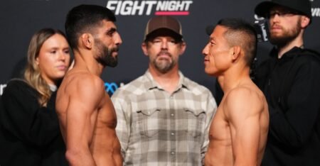 The bout was mostly a back-and-forth affair, with Gafurov’s hard-nosed pressure meeting Wiklacz’s long-range striking game and repeated guillotine attempts. With short time left in the fight, Gafurov shot in on Wiklacz who jumped on yet another guillotine choke, but this time, he really locked it in. Gafurov went to his back to defend but Wiklacz cranked the choke, forcing Gafurov to tap out a second before the final horn sounded.