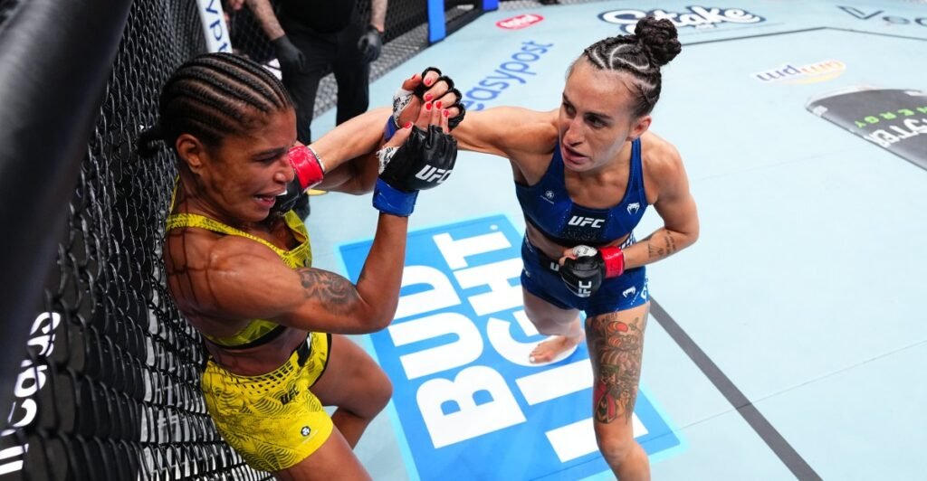 SEATTLE, WASHINGTON – MARCH 28: (R-L) Casey O’Neill of Scotland punches Gabriella Fernandes of Brazil in a flyweight fight during the UFC Fight Night event at Climate Pledge Arena on March 28, 2026 in Seattle, Washington. (Photo by Jeff Bottari/Zuffa LLC)